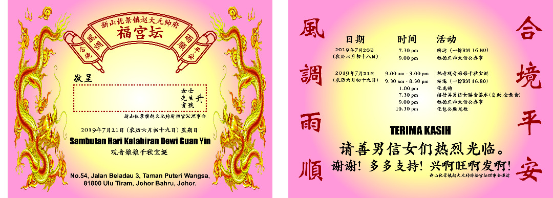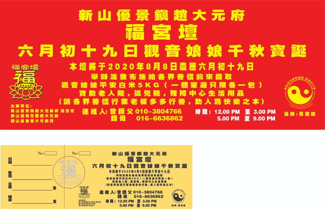 本坛将于8月16日(农历七月初十六日)到8月19日(农历七月初十九日)一连四天庆祝大二伯爷庆中元节孟兰勝会。