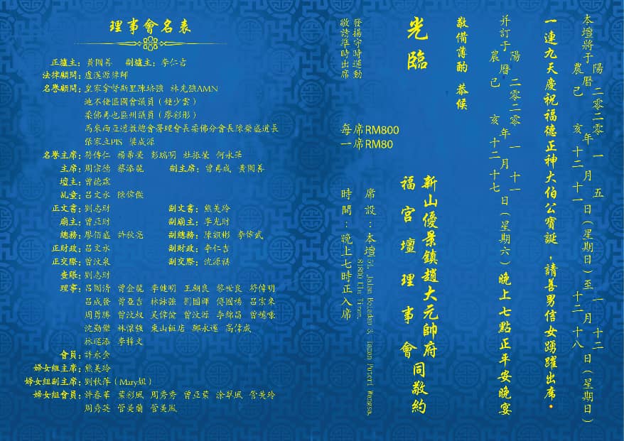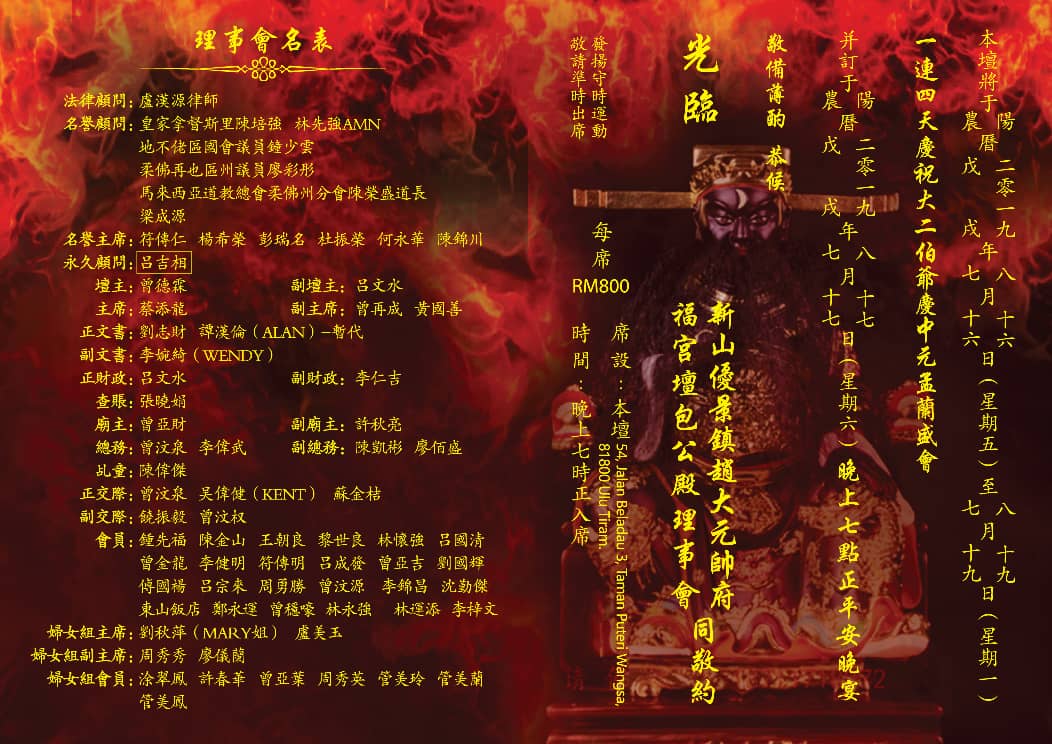 新山优景镇赵大元帅府福宫坛包公殿理事会邀请