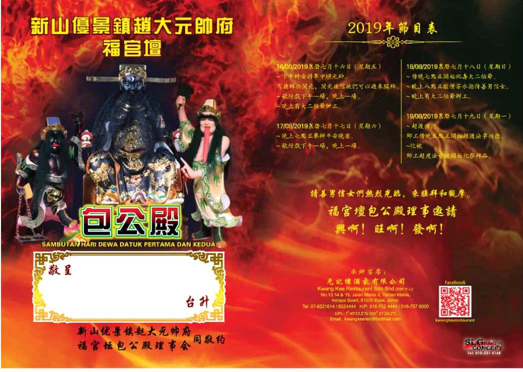 本坛将于8月16日(农历七月初十六日)到8月19日(农历七月初十九日)一连四天庆祝大二伯爷庆中元节孟兰勝会。